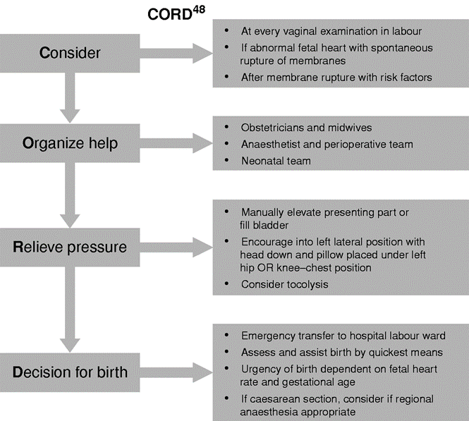 D. Prepare the client for an immediate birth: While preparing the client for an immediate birth may be necessary if the situation cannot be resolved quickly, the first step is to relieve pressure on the cord to prevent fetal compromise.