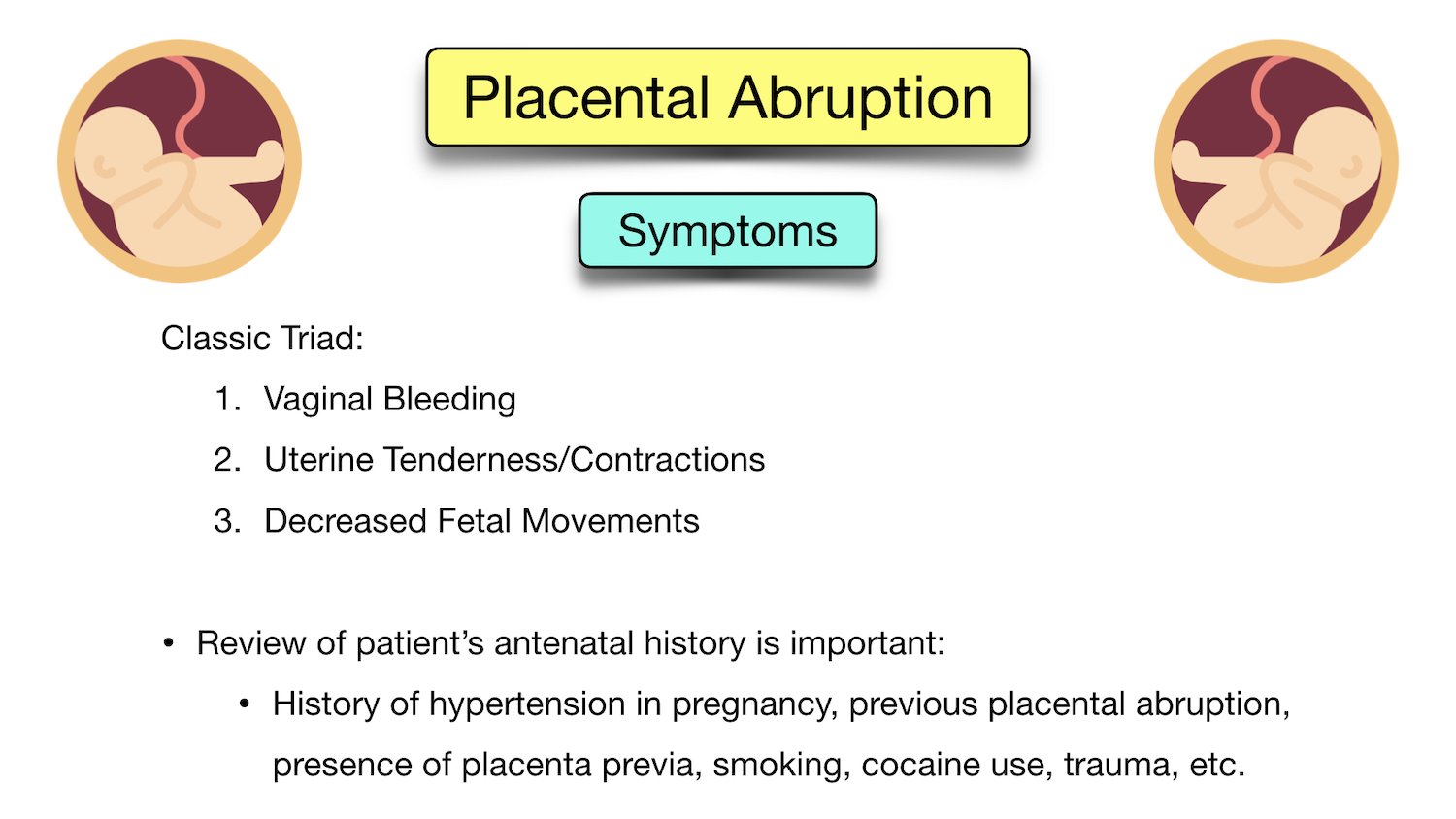 D. Fetal tachycardia: Fetal distress, including fetal tachycardia, is a potential complication of abruptio placentae. However, uterine tenderness is a more immediate and direct finding associated with the separation of the placenta.