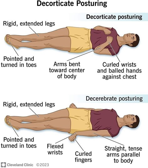 Extension of the extremities is not a characteristic of decorticate posturing. Extension of the extremities is more characteristic of decerebrate posturing, where arms and legs are straight and rigid¹.
