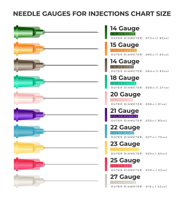 The most common syringe used for IM injections is a standard 3-mL size, marked in milliliters to the nearest tenth. Select the standard gauge range of the injection needle for an IM injection.
