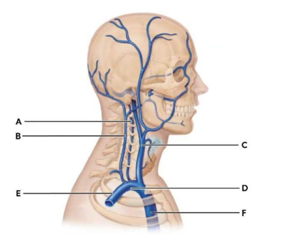 C. C (Internal jugular vein): The internal jugular veins are the principal veins that drain blood from the brain, superficial face, and neck. They originate from the dural venous sinuses at the base of the skull and descend within the carotid sheath lateral to the internal carotid artery and common carotid artery. They join the subclavian veins to form the brachiocephalic veins.