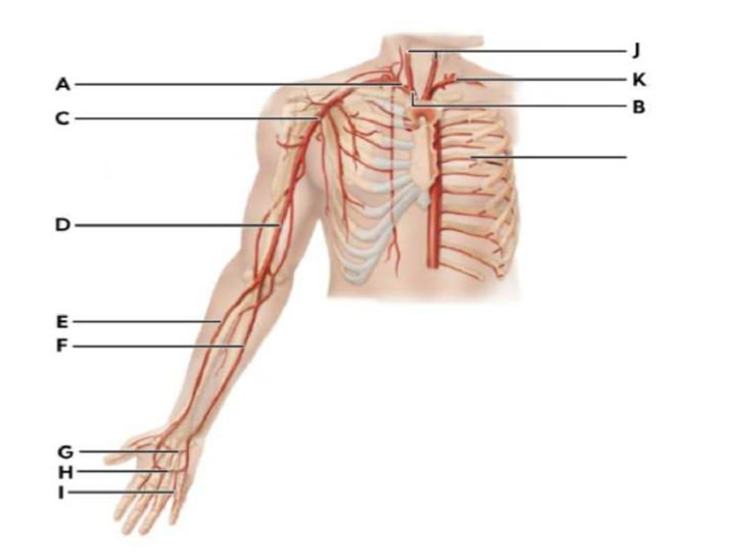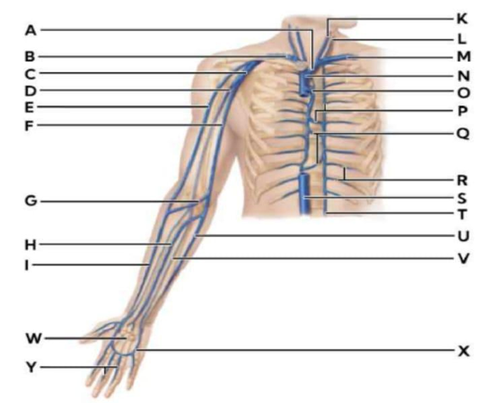 A. E (Brachiocephalic vein): The brachiocephalic veins are large veins formed by the union of the internal jugular and subclavian veins on each side of the body. The left and right brachiocephalic veins converge to form the superior vena cava. They serve as major conduits for venous blood returning from the head, neck, upper limbs, and thorax to the heart.