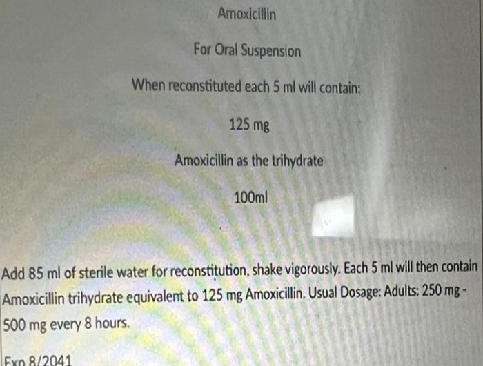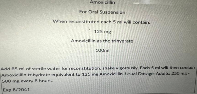Order: Amoxicillin 125 mg PO q 8h (Refer to medication label)