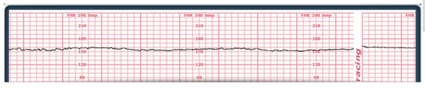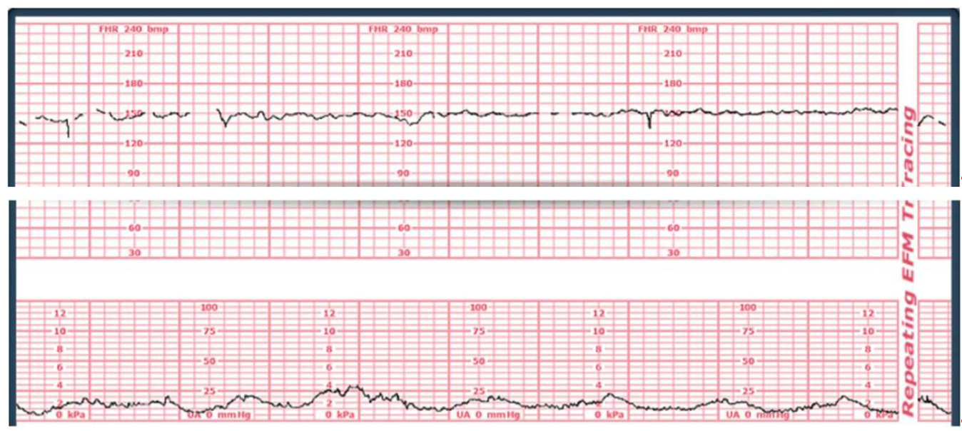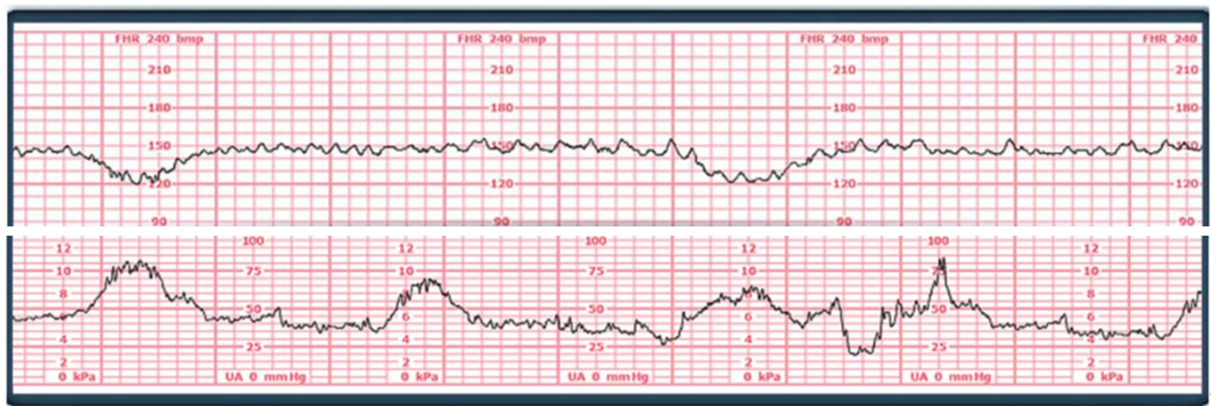 A 37-week client is stating she is having severe back pain and is placed on an external monitor. The monitor shows the following fetal and contraction tracing.