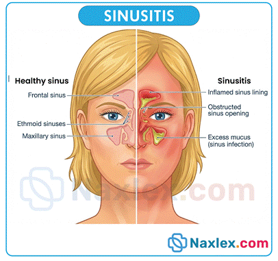 - Sinusitis results from obstruction of sinus drainage, leading to microbial growth, facial pain, and purulent discharge.