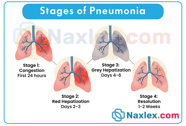 - Gray Hepatization: Blood flow decreases; leukocytes and fibrin consolidate in the affected area.
