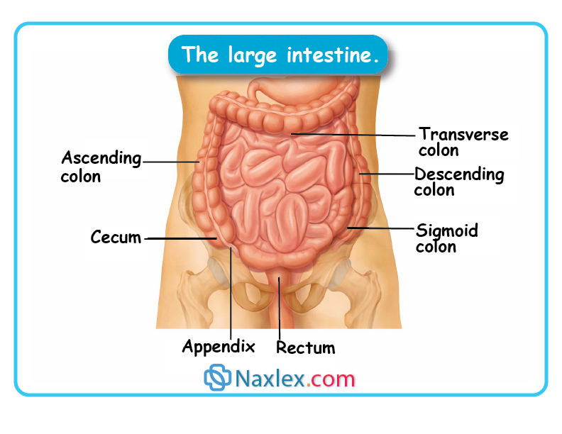 - Primary functions of the large intestine are the absorption of water and nutrients, the mucoid protection of the intestinal wall, and fecal elimination.