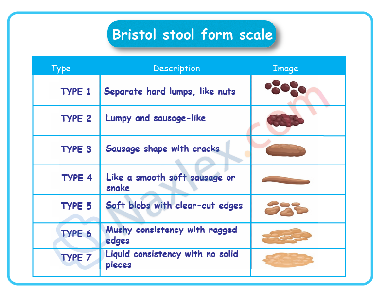 - Characteristics of the stool (amount, color, consistency).