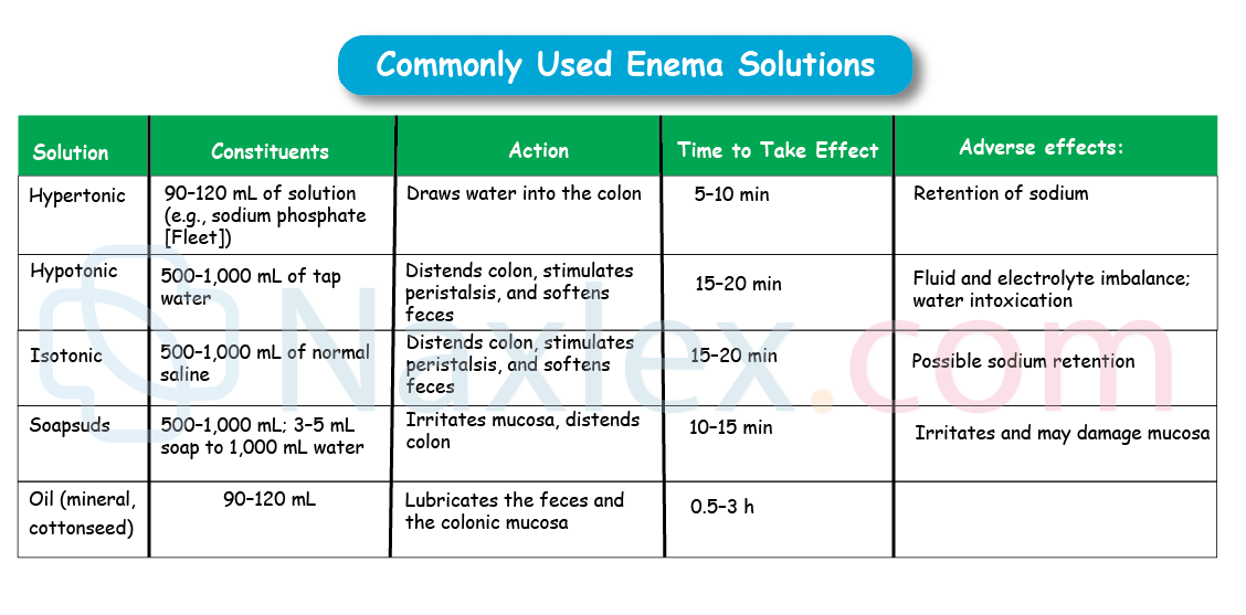 - Apply safety principles: High, large-volume enemas increase risk for fluid & electrolyte imbalance.