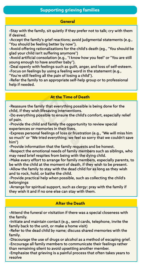 - At the end of life, nurses provide meticulous care to the child while offering compassionate emotional and physical support to the family, addressing their grief and helping them navigate difficult decisions such as DNAR orders and postmortem care. This also extends to supporting siblings and the family after the death, acknowledging the profound and lasting impact of their loss.
