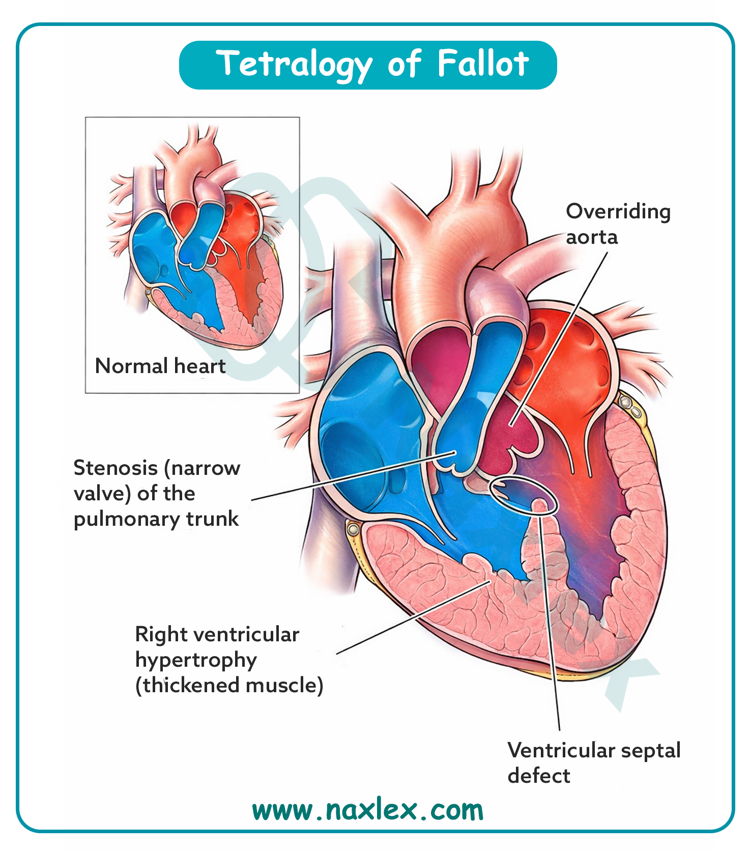 - Overriding aorta: The aorta is positioned directly over the ventricular septal defect instead of over the left ventricle, allowing oxygen-poor blood from the right ventricle to enter the aorta.