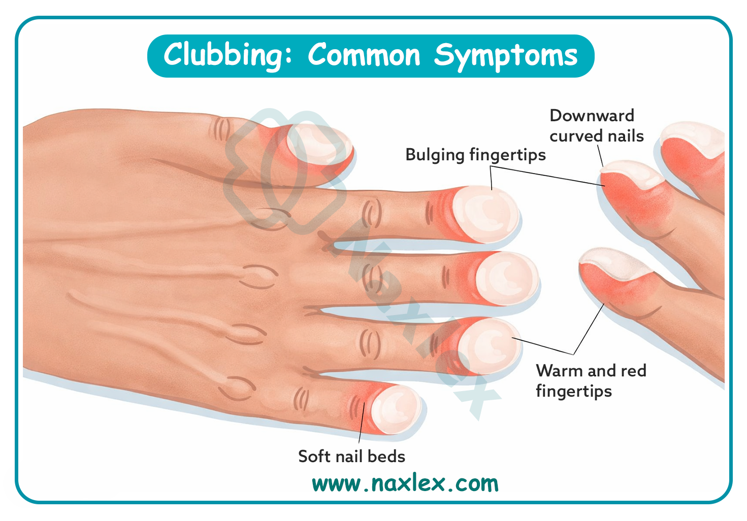 - Clubbing: Softening of the nail beds and rounding of the fingertips due to chronic low oxygen levels.
