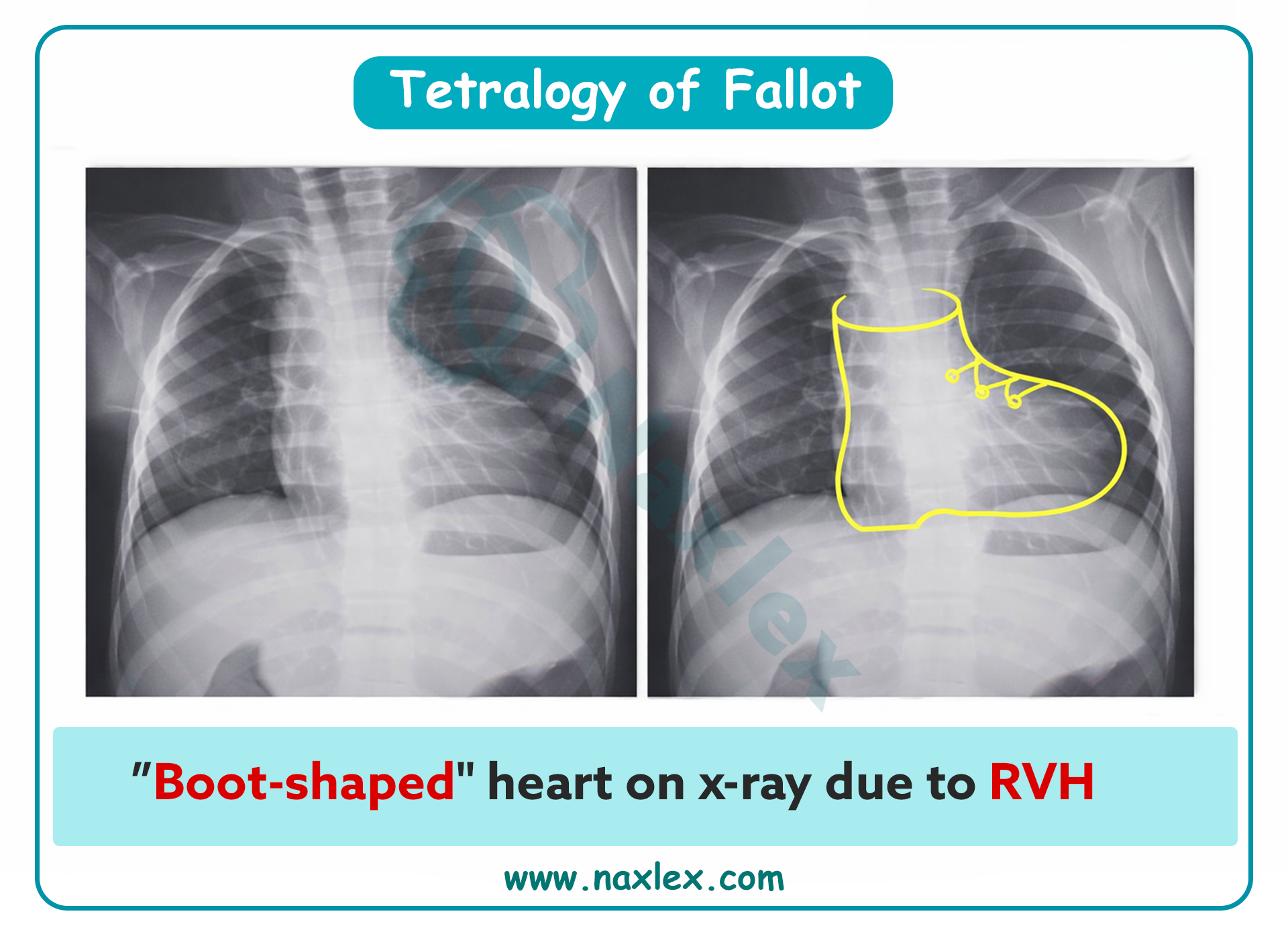 - Chest X-Ray: Classically reveals a "boot-shaped" heart (coeur en sabot) caused by the upturned apex from right ventricular hypertrophy and a narrow pulmonary waist.