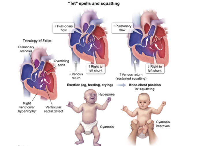 - Knee-chest position or squatting: Increases systemic vascular resistance, which reduces the right-to-left shunt and forces more blood into the lungs.