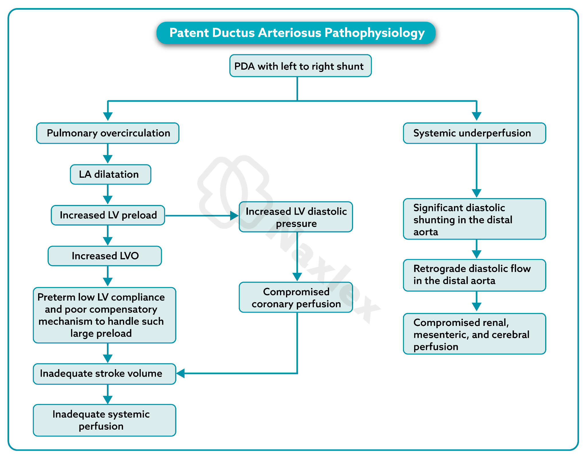 - Steal Phenomenon: In large PDAs, blood is "stolen" from the systemic circulation during diastole, resulting in low diastolic blood pressure and decreased perfusion to distal organs (e.g., gut and kidneys).