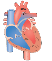 - Patent ductus arteriosus (PDA) is a common congenital heart defect where the ductus arteriosus—a fetal vascular connection between the main pulmonary artery and the descending aorta, fails to physiologically close after birth. In utero, this vessel shunts blood away from the non-functional lungs. Postnatally, its persistence results in a left-to-right shunt.