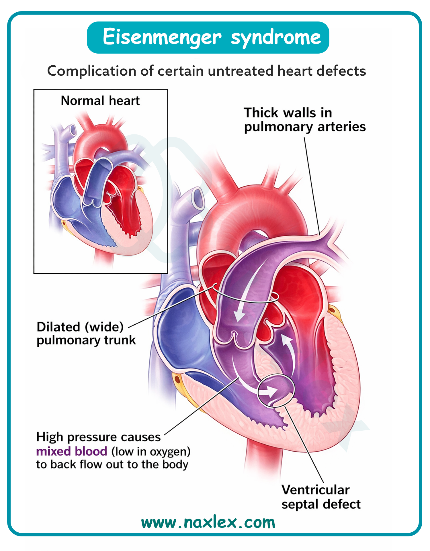 - If these defects are left uncorrected, the chronic high-pressure flow can cause permanent damage to the pulmonary vasculature. This may eventually lead to Eisenmenger Syndrome, where pulmonary resistance becomes so high that the shunt reverses (right-to-left), resulting in systemic cyanosis.