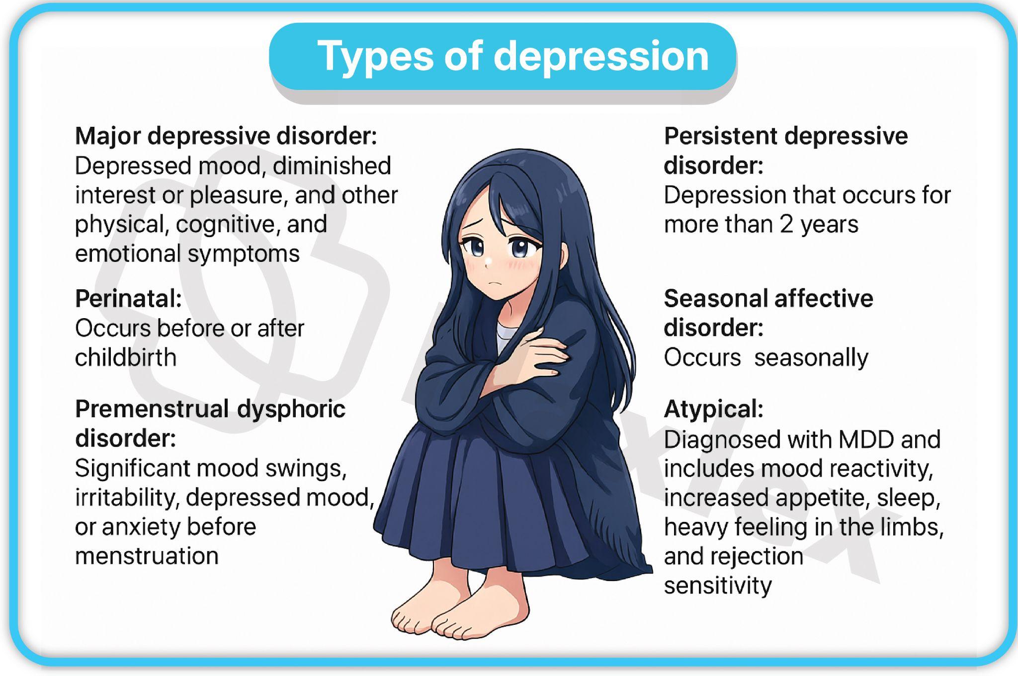 - The DSM-5-TR delineates several types, including Major Depressive Disorder (MDD), Persistent Depressive Disorder (Dysthymia), Disruptive Mood Dysregulation Disorder (DMDD), and Premenstrual Dysphoric Disorder (PMDD).