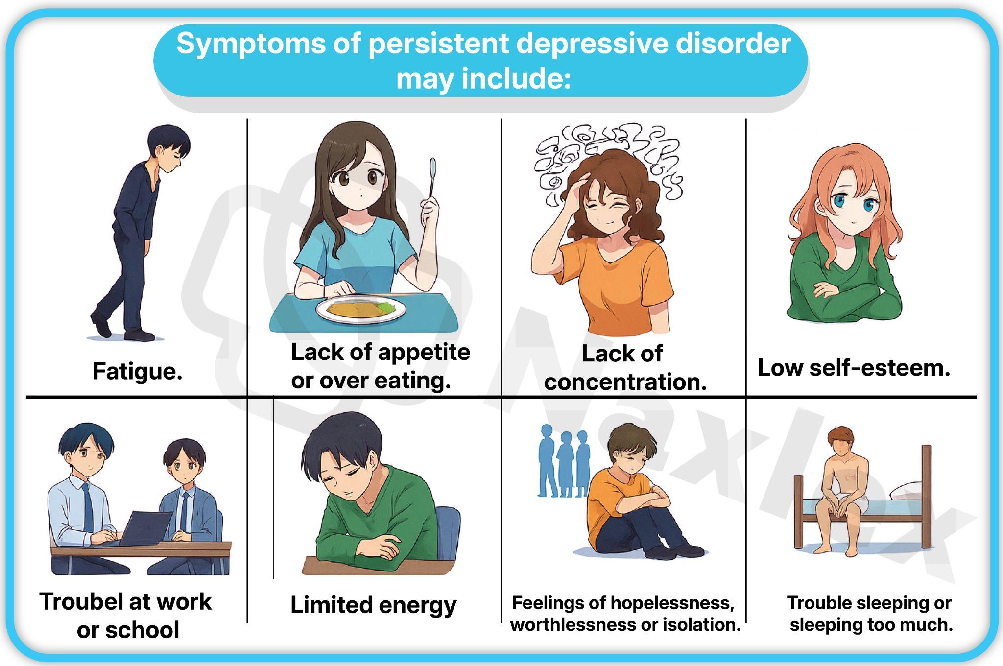 - Symptoms are milder than major depression but persistent and functionally impairing.