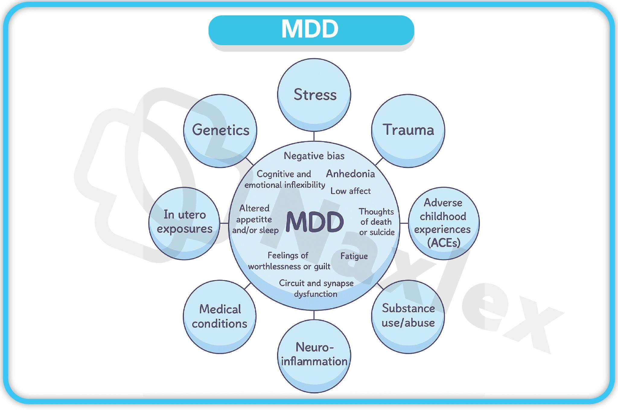 - Neurobiology: Dysregulation of neurotransmitters (serotonin, norepinephrine, dopamine) and structural/functional changes in brain regions like the hippocampus and prefrontal cortex.