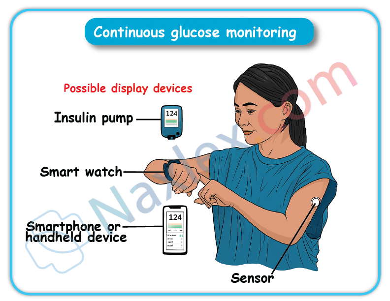 - Continuous glucose monitoring systems provide interstitial glucose trends every 5 minutes via subcutaneous sensors, alerting for hypoglycemia <70 mg/dL or hyperglycemia >180 mg/dL, with calibration twice daily against capillary values for precision within 10-15%.