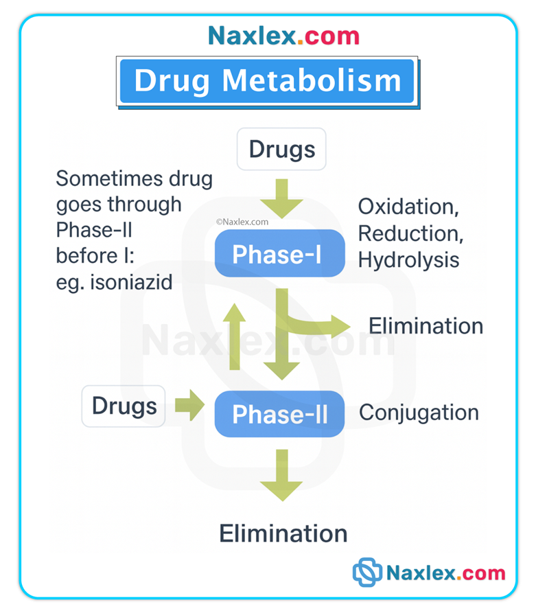 • Metabolism: primarily hepatic via enzyme systems; can inactivate drugs or produce active metabolites. Genetic differences and liver disease greatly affect metabolism. Half-life and steady state are functions of metabolism/elimination.