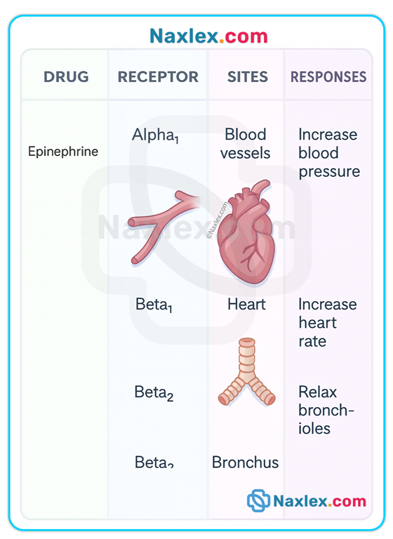 • Nonselective: drug affects multiple receptor subtypes leading to varied effects at different organs (e.g., bethanechol stimulates cholinergic receptors in bladder, heart, bronchi, and GI tract → bladder contraction + bradycardia + bronchoconstriction + increased gastric secretions).