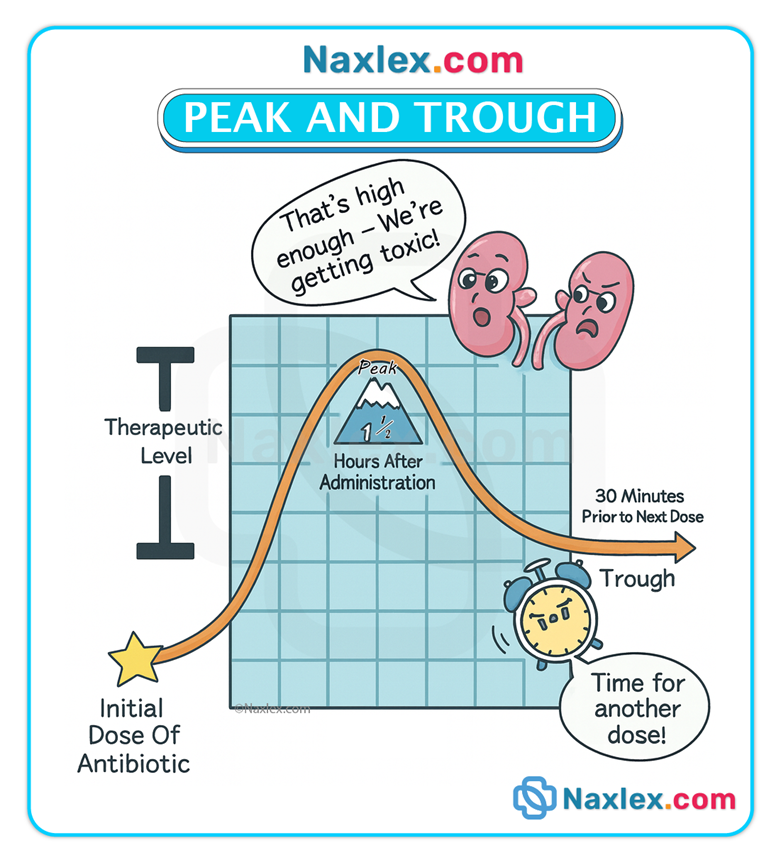 • Trough level: indicates elimination; drawn immediately before the next dose.