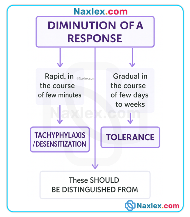 • Tolerance: gradual decrease in response over time requiring higher doses for same effect (seen with opioids).