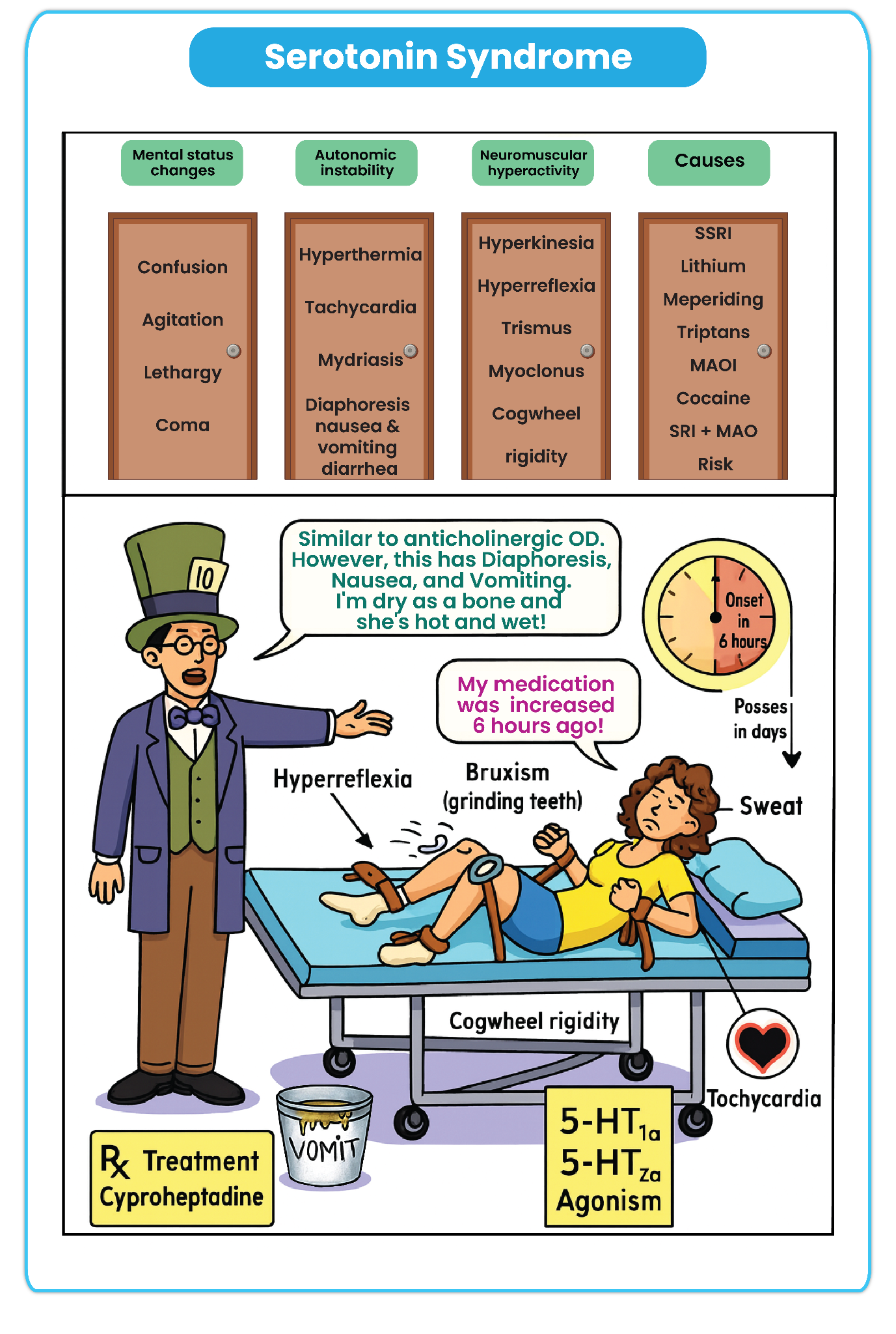 - Severe interaction with SSRIs, SNRIs, TCAs, meperidine → Serotonin syndrome