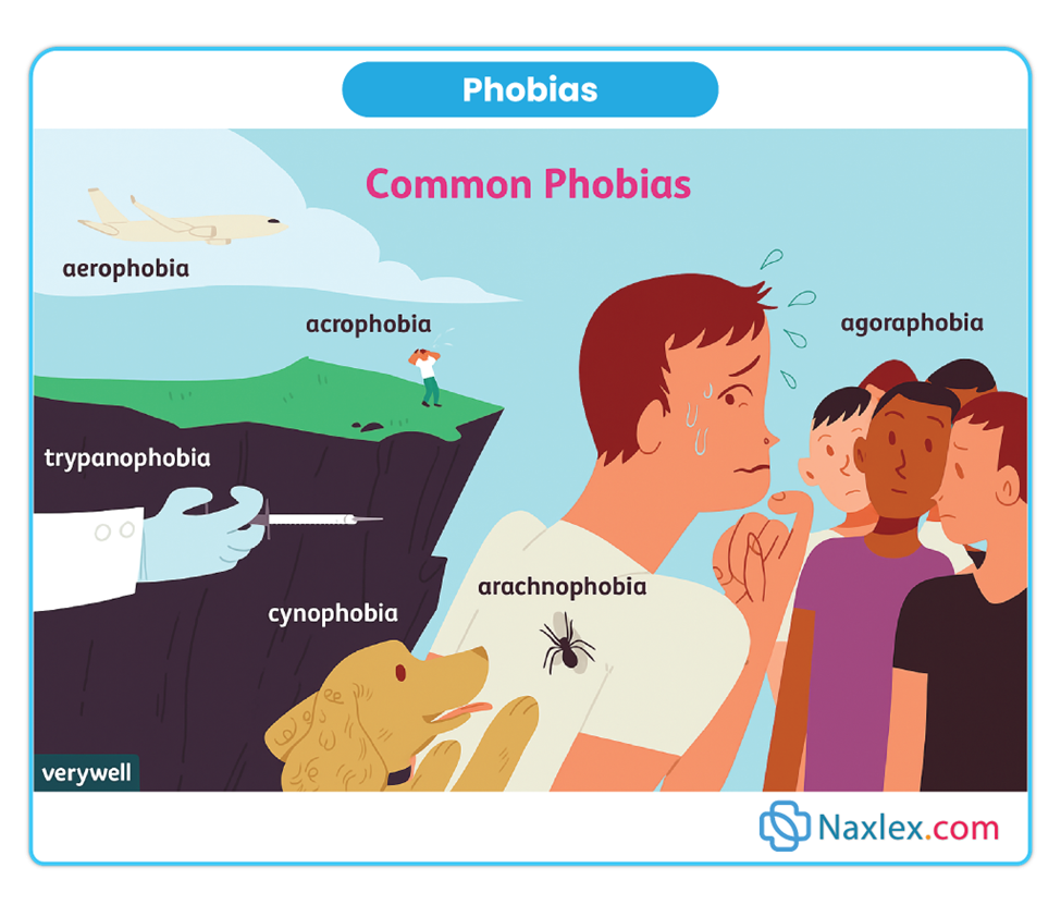 - Phobias: Irrational fear of specific objects or situations (e.g., social, simple phobias).