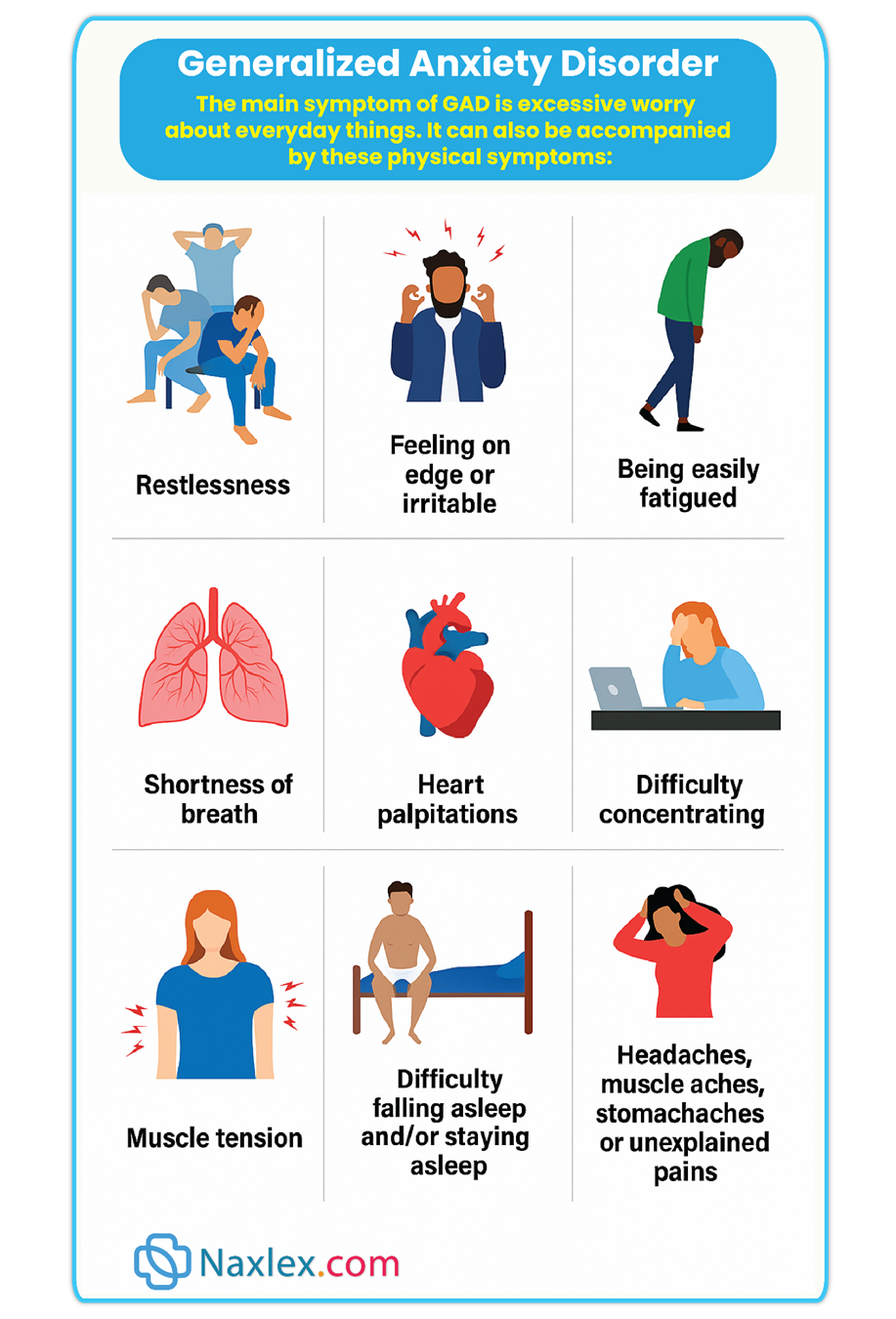 Generalized Anxiety Disorder (GAD) is one of the most commonly encountered anxiety disorders in clinical practice. It is defined by persistent, uncontrollable worry that spans various aspects of daily life, such as health, work, finances, and relationships. Identifying this hallmark pattern of excessive worry lasting for at least 6 months helps nurses screen, refer, and support clients with chronic anxiety symptoms.