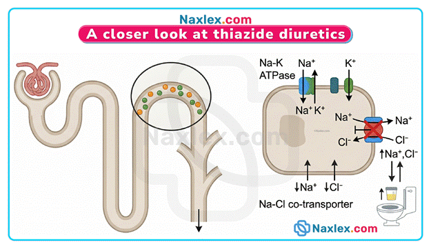 - Mechanism: inhibit Na⁺-Cl⁻ symporter in distal tubule → moderate diuresis.