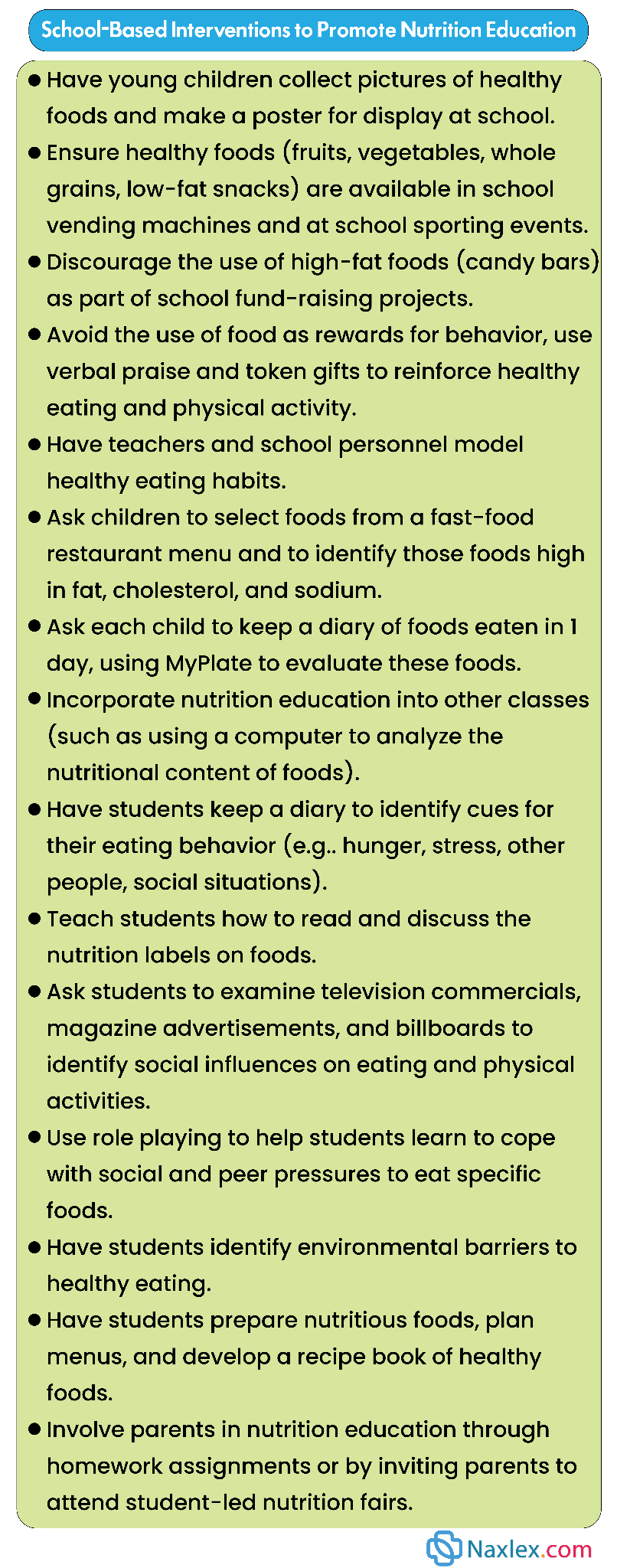 - Nutrition education should focus on balanced meals and the dangers of excessive screen time versus the benefits of at least 60 minutes of daily physical activity.