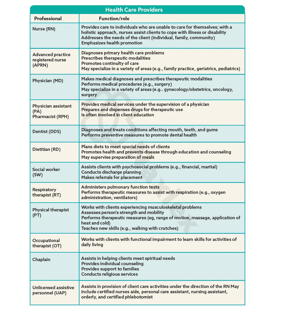 - The role of the nurse in providing care to clients will vary depending on the employment setting, the nurse’s credentials, and the needs of the client.