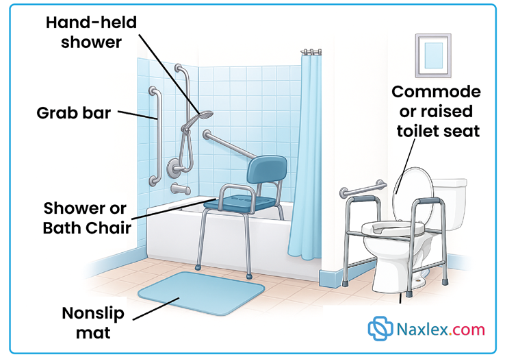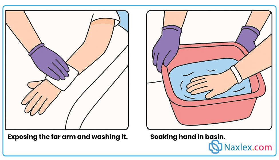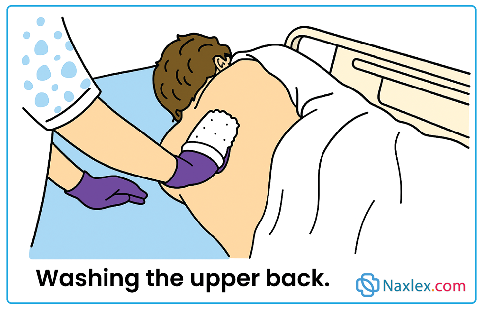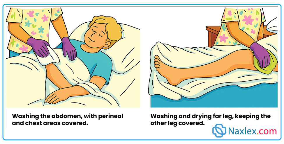 - Promote independence by assisting only where needed (help with back/hands/feet, encourage remaining self-care).