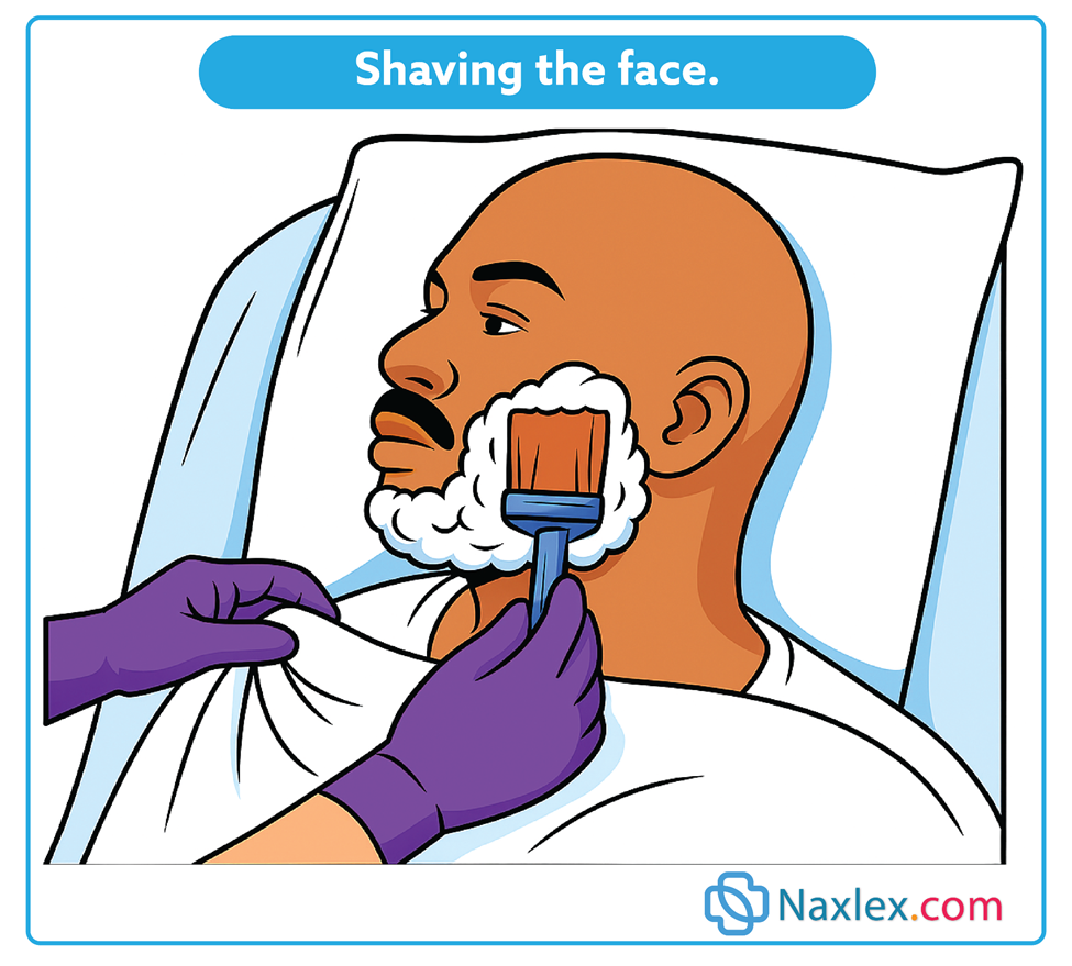 Before shaving, the nurse must assess bleeding risk (medications like warfarin, heparin, antiplatelet agents, or coagulopathies) because shaving with a blade can cause bleeding. If the patient is anticoagulated or at high bleeding risk, use an electric razor or consult policy/MD. Routine hygiene tasks require assessment and adaptation to the patient’s safety needs.