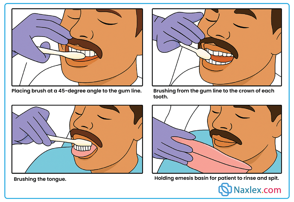 2. It prevents deterioration of the oral cavity: Regular oral care reduces plaque buildup, tooth decay, gingivitis, halitosis, and ulcer formation. This preserves oral integrity, reduces pain, and prevents long-term complications.