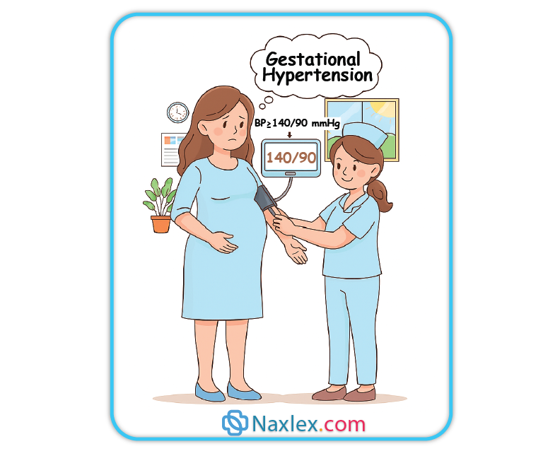 Gestational hypertension is a pregnancy-specific hypertensive disorder characterized by new-onset elevated blood pressure after mid-gestation without accompanying proteinuria or systemic features. It typically arises after 20 weeks of gestation and resolves postpartum. The diagnostic threshold is systolic ≥140 mmHg or diastolic ≥90 mmHg on two occasions at least 4 hours apart. It must be distinguished from preeclampsia, which includes proteinuria or end-organ dysfunction, and from chronic hypertension, which occurs before 20 weeks or persists beyond 12 weeks postpartum.