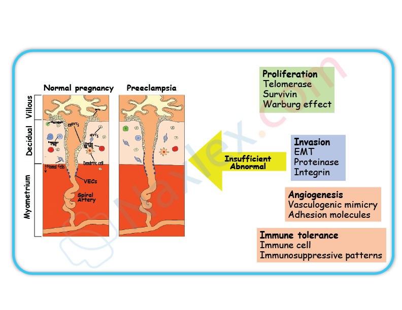 - Abnormal trophoblastic invasion leads to inadequate remodeling of spiral arteries, resulting in poor uteroplacental perfusion.