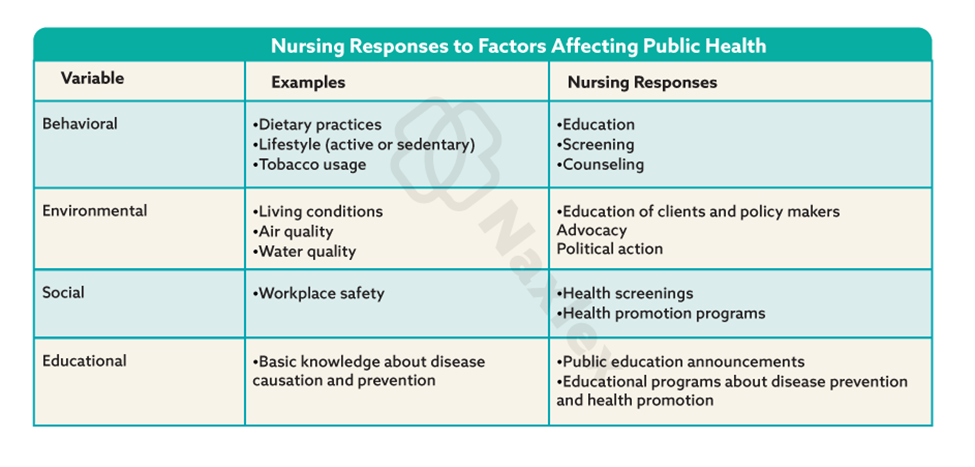 The public health perspective focuses on prevention as opposed to illness. In order to promote community health, public health nurses perform the following functions: