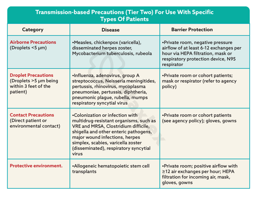 - Transmission-based precautions, including airborne, droplet, contact, and protective environment, are used in addition to Standard Precautions for patients with highly transmissible pathogens.