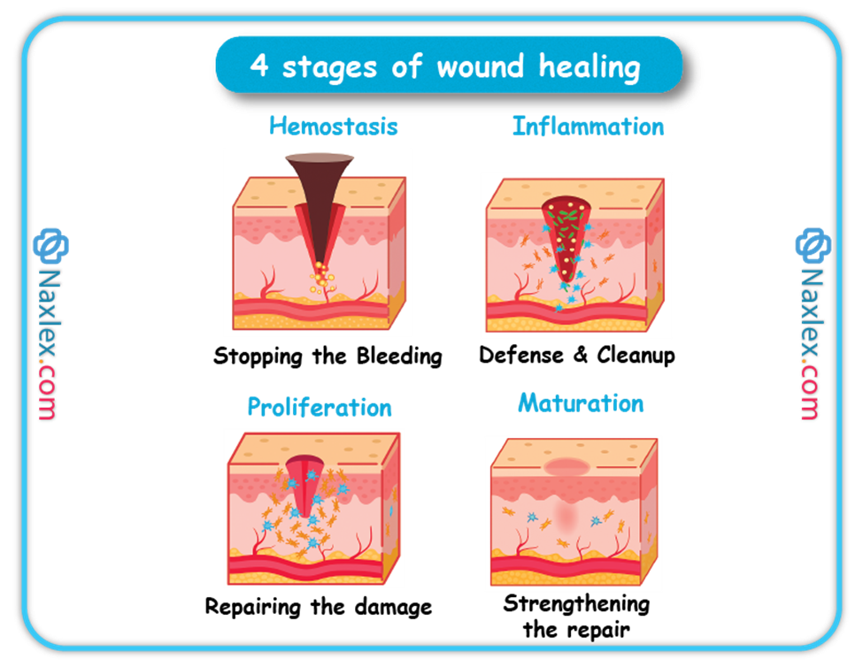 - The wound healing process proceeds through four overlapping phases: hemostasis, inflammation, proliferation, and maturation.