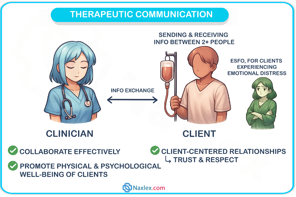 - Therapeutic communication includes active listening, reflecting, clarifying, and summarizing.