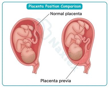 - Placenta Previa: Occurs when the placenta partially or completely covers the cervical os, leading to painless vaginal bleeding, typically in the third trimester.