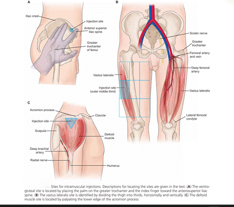 4. A 1-inch needle: A 1" needle may suffice for deltoid in a slender adult, but for deep IM-especially in the ventrogluteal site and with this volume-it risks depositing medication subcutaneously.