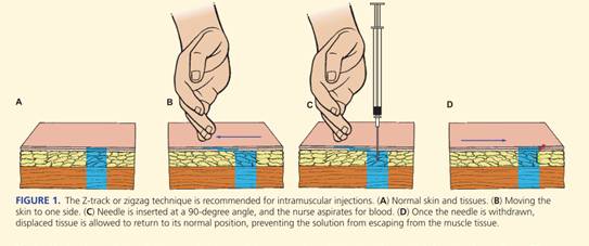 - Use Z-track and pick a large muscle (ventrogluteal) for volumes >2 mL.