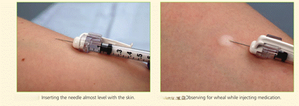 - Use a tuberculin (1 mL) syringe with a fine (25–27 ga), very short needle for intradermal injections to ensure a proper wheal.