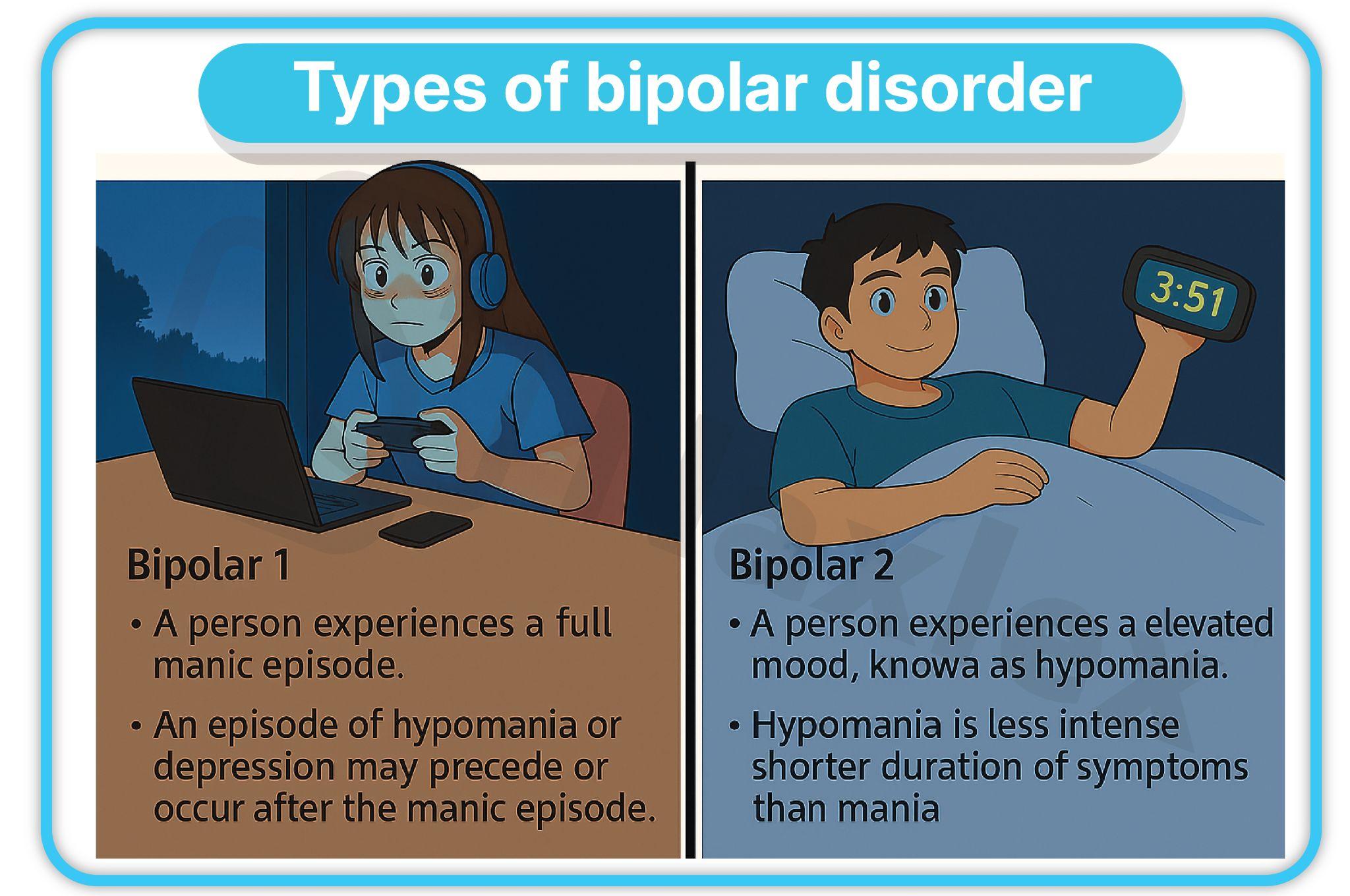 - Bipolar I disorder is diagnosed after at least one manic episode, often with reduced sleep and heightened energy.