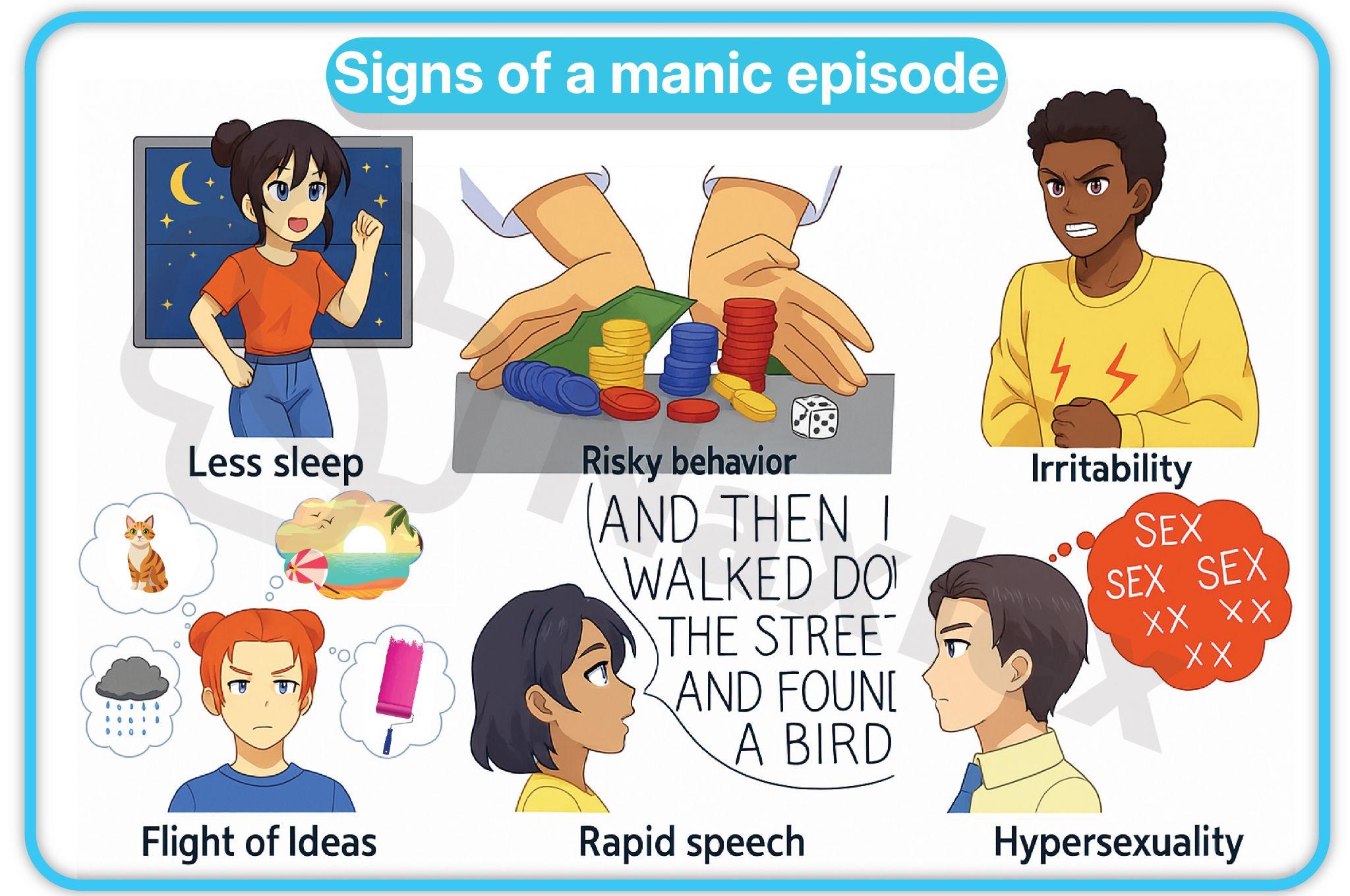 - Mood/Affect: Mood is often euphoric, irritable, or expansive. Affect is often labile and can change rapidly.